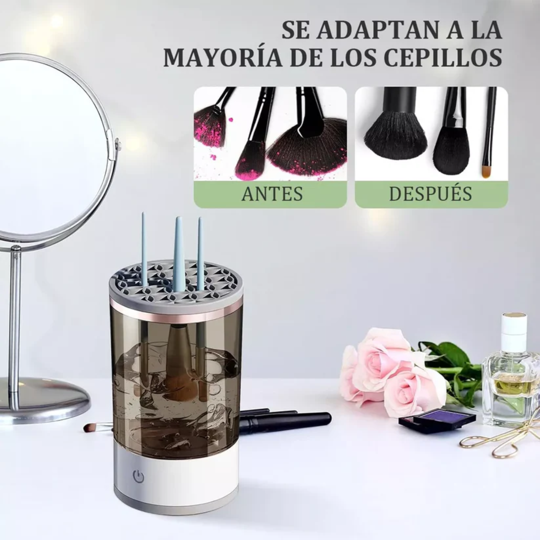 - Incluye: Varios adaptadores para diferentes tamaños de brochas, base de limpieza y manual de instrucciones.
